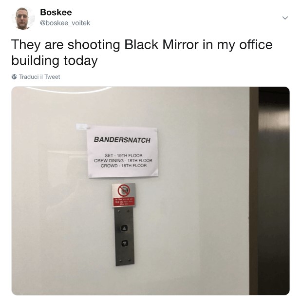 Come vediamo in questa foto per il 28 di Dicembre sarebbe fissato questo fantomatico Black Mirror: Bandersnatch. La foto è stata eliminata poco dopo dal social di Netflix però chiaramente i fan sul web hanno già indagato e scoperto che effettivamente durante i mesi scorsi (precisamente in primavera) sempre su Twitter un utente ha postato una immagine dove a quanto pare in quel momento stavano girando proprio questo episodio “Bandersnatch”. Che sia in arrivo veramente un nuovo episodio di Black Mirror? per ora sembrebbe di sì, però la conferma non è ancora arrivata da Netflix e teniamo a precisare che tutti i titoli che ci sono in questa immagine valgono solo per Netflix USA e non per il nostro paese purtroppo (tranne gli originali Netflix ovviamente).