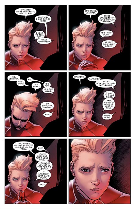 Un proscioglimento che arriva nel momento in cui Jennifer Walters esce dal coma in cui era entrata in seguito allo scontro con Thanos; tocca a Carol Danvers, Captain Marvel, svelarle la morte dell’amato cugino e l’esito del processo al suo assassino, e non sembra che She-Hullk prenda la cosa troppo bene! Sicuramente non ha assorbito bene questo finale Tony Stark, che in questo periodo sta vedendo crollare il suo mondo. La morte di Rhodes, quella di Banner e il difficile momento per le Stark Industries (come abbiamo visto in Invincibile Iron Man) stanno facendo sentire il loro peso sulle spalle del genio in armatura, ma a dare il colpo di grazia è l’esito degli studi fatti sul cervello di Ulysses, iniziato da Stark per cercare di comprendere il reale potere del giovane inumano.