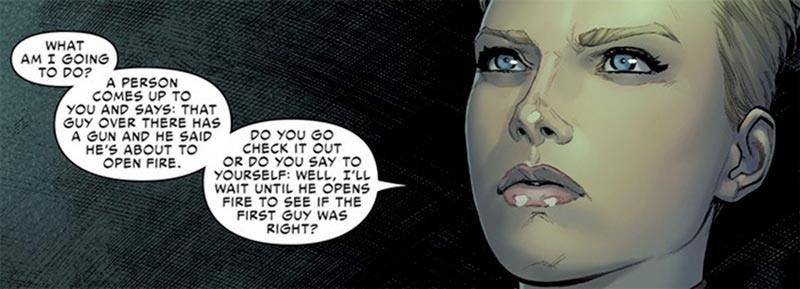 E ora mi ritrovo nella stessa situazione con Civil War II. La questione del potere di premonizione di Ulysses è una bella trovata, ma mi ha stupito come la posizione di Tony sia quella di non accettare questo strumento, soprattutto in funzione della sua scelta di sostenere all’epoca l’atto di registrazione dei metaumani; per quanto sostenga (a mio parere, a ragione) che l’uso dei poteri dell’inumano sia una violazione alla libertà individuale, mi confonde come la posizione sembri stridere con le sue scelte al tempo della strage di Stamford.