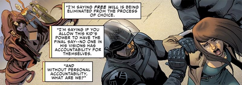Per Iron Man la capacità di Ulysses è pericolosa, in quanto vivendo lui direttamente le esperienze non può non rimanere influenzato nel suo giudizio; senza contare che non sono previsioni esatte, ma semplici previsioni. Anzi, spesso ricorre il termine profilazione, ovvero una sorta di analisi di vari soggetti tramite la quale prevedere le loro potenziali mosse; per Tony il termine potenziale è la chiave della vicenda, visto che si giudica la gente, amica o nemica, solo sulla percezione di una loro eventuale azione, con un processo alle probabile intenzioni. Ma se Tony sembra considerare questa lacuna un segnale d’allarme, per la Danvers la semplice possibilità che la previsione possa avverarsi è sufficiente per far sì che il soggetto incriminato venga fermato.