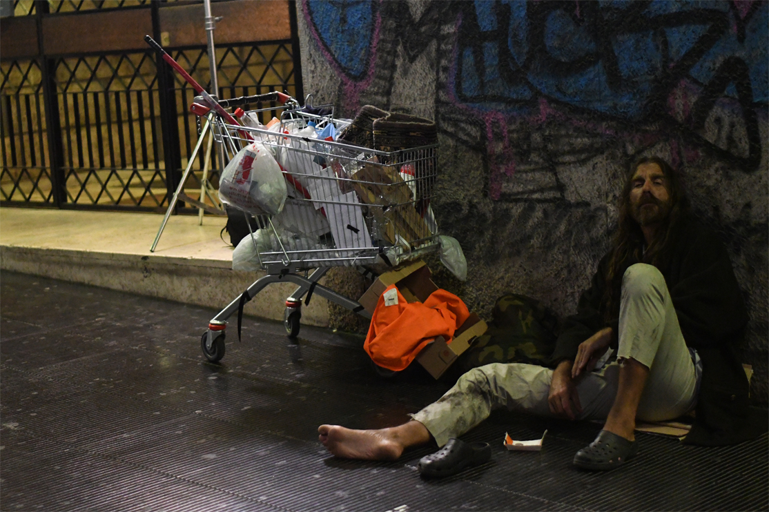 3. Due figure: un senzatetto seduto vicino ad un muro, di fronte a lui una persona vestita in abiti