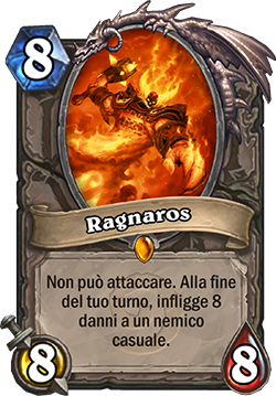- Ragnaros è molto presente nei mazzi controllo e mid-range, comparendo addirittura come “mossa finale” in certi mazzi aggro. La sua alta e immediata valenza e potenza al costo di 8 Mana spinge a chiedersi durante la creazione di un mazzo: “Questo servitore da 8 Mana è migliore di Ragnaros?”, invece che “Questo servitore da 8 Mana è la scelta migliore per il mio mazzo?”. Decine di carte nell’intervallo di costo 7-9 Mana non sono mai state utilizzate per “colpa” di Ragnaros, che era sempre la scelta più semplice in quell’intervallo, visto che diversi mazzi prediligono l’uso di una sola carta a costo alto.