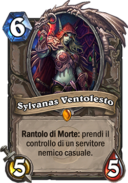 - Come per il Draco di Zaffiro, è difficile trovare una carta da 6 Mana che equivalga a Sylvanas, la quale, oltretutto, ha il Rantolo di Morte più potente del gioco. Giusto per fare un paragone: il Controllo Mentale del Sacerdote costa 10 Mana. Abbiamo progetti molto interessanti per i mazzi creati sulla meccanica del Rantolo di Morte che, in combinazione con Sylvanas, sarebbero troppo potenti in formato Standard.