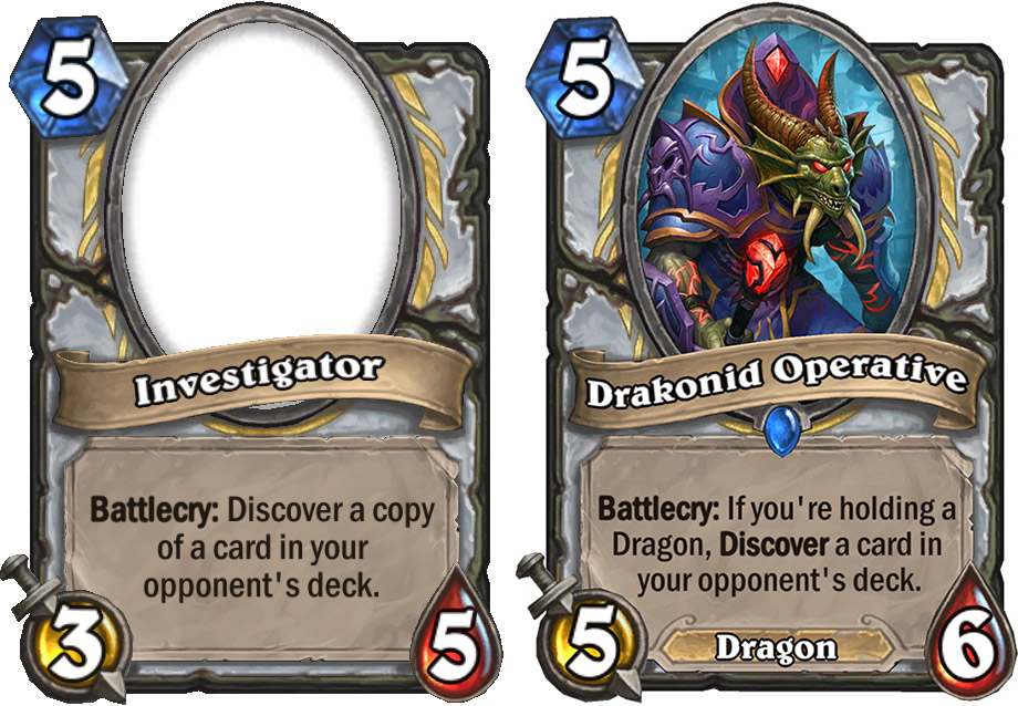 L’idea di Agente Draconide era riservata alla Leggendaria di Classe, ma gli sviluppatori temevano che senza l’attivazione condizionale la carta sarebbe stata in ogni mazzo Sacerdote per i prossimi due anni. (Grido di Battaglia: Rinvieni una carta dal mazzo del tuo avversario.)