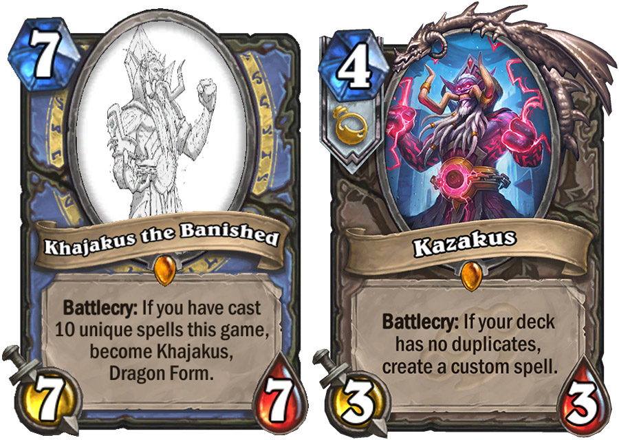 Kazakus all’inizio si chiamava Khajakus the Banished e la sua Dragon Form ricordava il potere di Executus. Tracce di questo design sono rimaste nella descrizione della carta e in alcuni artwork (Se hai lanciato 10 magie uniche in questa partita, diventa Khajakus Forma Draconica.)