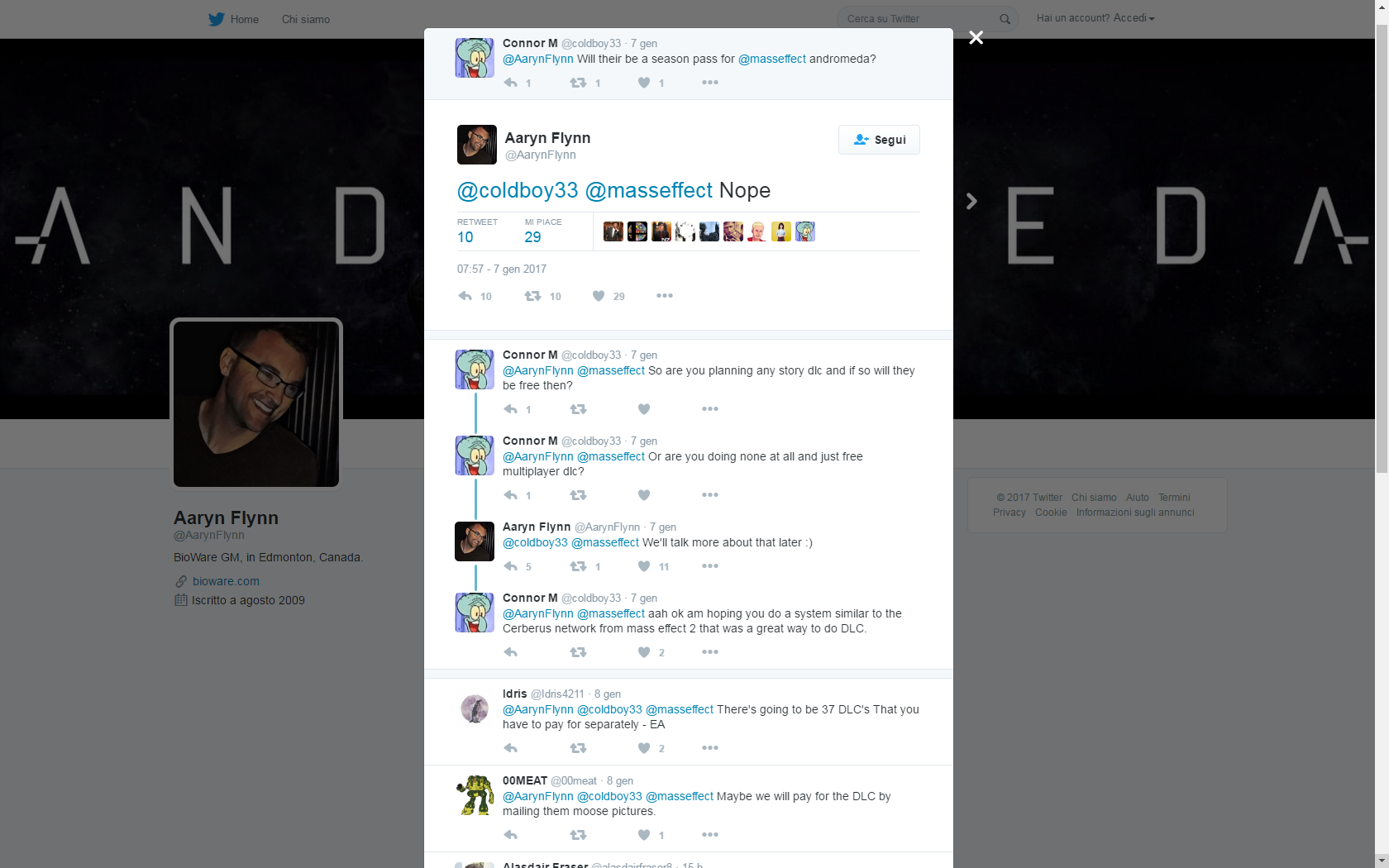 Aaryn Flynn, general manager di BioWare, ha confermato l’assenza di un season pass per Mass Effect Andromeda. Rispondendo su Twitter alle domande di alcuni fan, Flynn ha fermato le speculazioni a riguardo assicurando che non è previsto alcun season pass, ma che non esclude la possibilità di eventuali rilasci di DLC che espandano la storia in seguito. Possiamo solo sperare che BioWare abbia fatto tesoro dei problemi sul DLC richiesto per dare un senso al finale di Mass Effect 3!