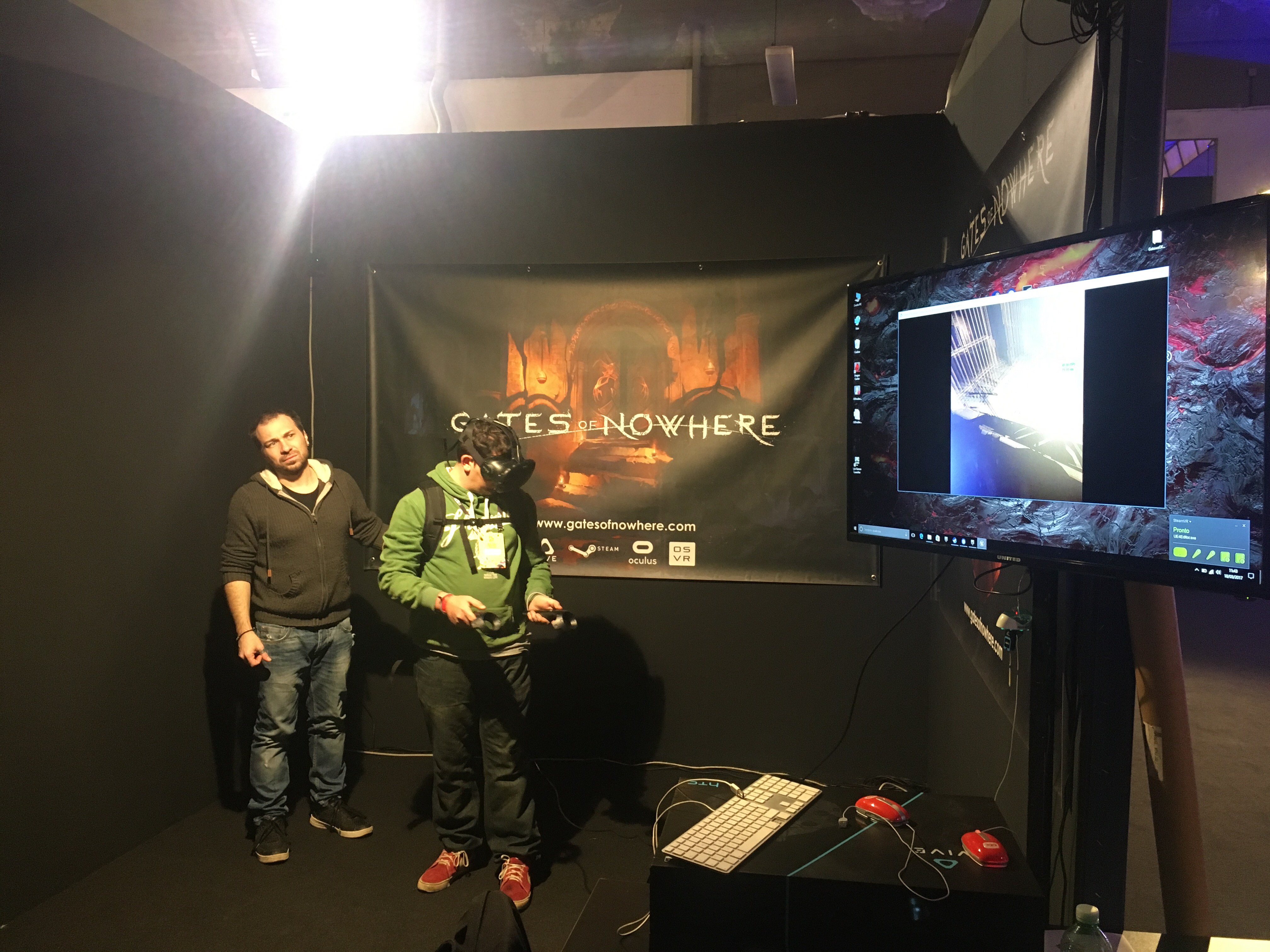 A questa fiera non poteva mancare il sogno di ogni gamer, la realtà virtuale. Grazie ai ragazzi di Symmetrical abbiamo testato la realtà virtuale sviluppata con Vive. Il titolo sviluppato ha il nome di “Gates of nowhere” il quale ci catapulterá dentro dei sotterranei dalla quale noi dovremo fuggire tramite l’utilizzo di oggetti come armi e altro. Il titolo è ancora in fase di sviluppo ed infatti i ragazzi della Symmetrical aggiornavano in tempo reale il gioco in modo tale da fixare bug grafici e bug ai dispositivi che ci avrebbero aiutato a fuggire dai sotterranei. Purtroppo unica nota dolente riguarda l’angolo YouTube, non siamo riusciti infatti a stilare nessuna intervista, questo perché l’accesso ai backstage era bloccato per motivi di sicurezza.